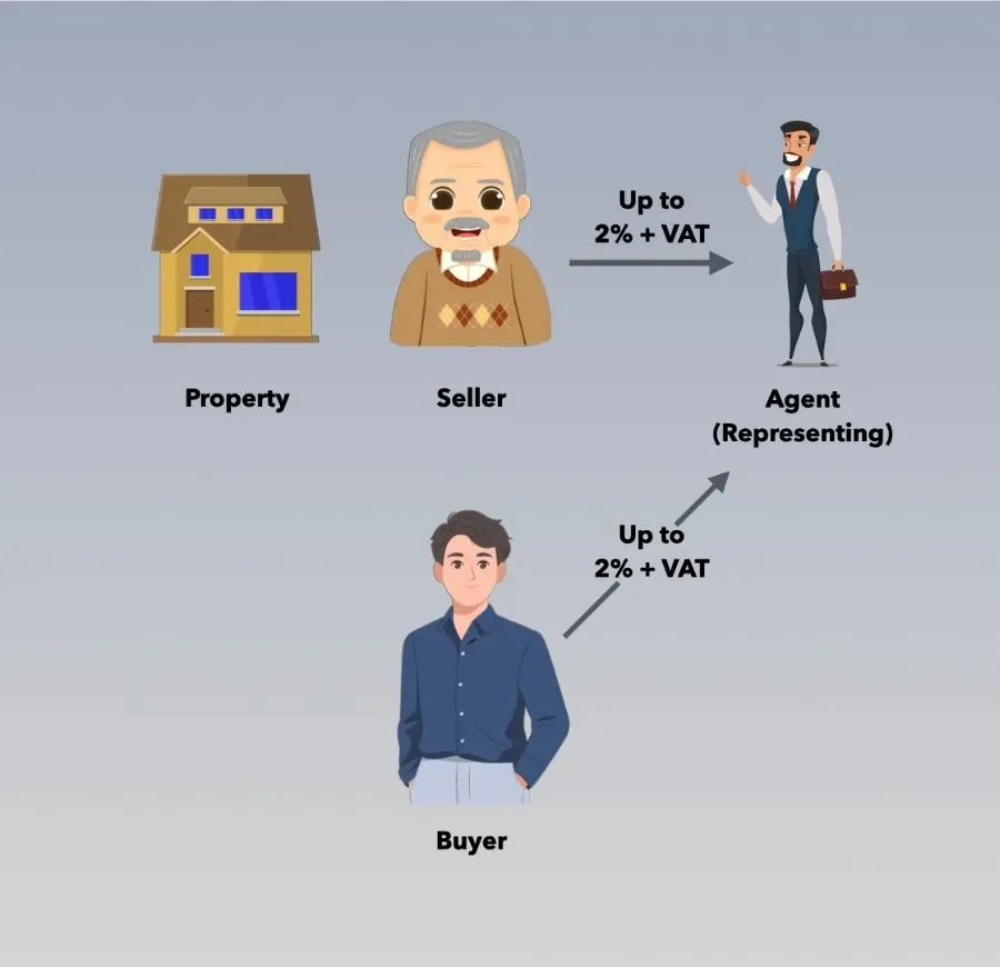 Let’s assume a buyer approaches the agent and wants to buy the property. Then the representing agent would earn up to 2% + VAT from the buyer and also up to 2% + VAT from the seller (situation depicted on picture).